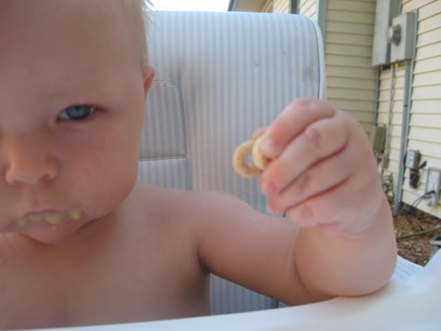 and mom got so very excited about it that he showed it off by hanging it...AND he can get it to his mouth too!